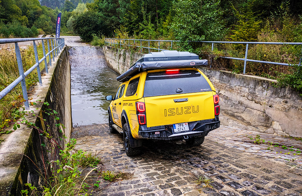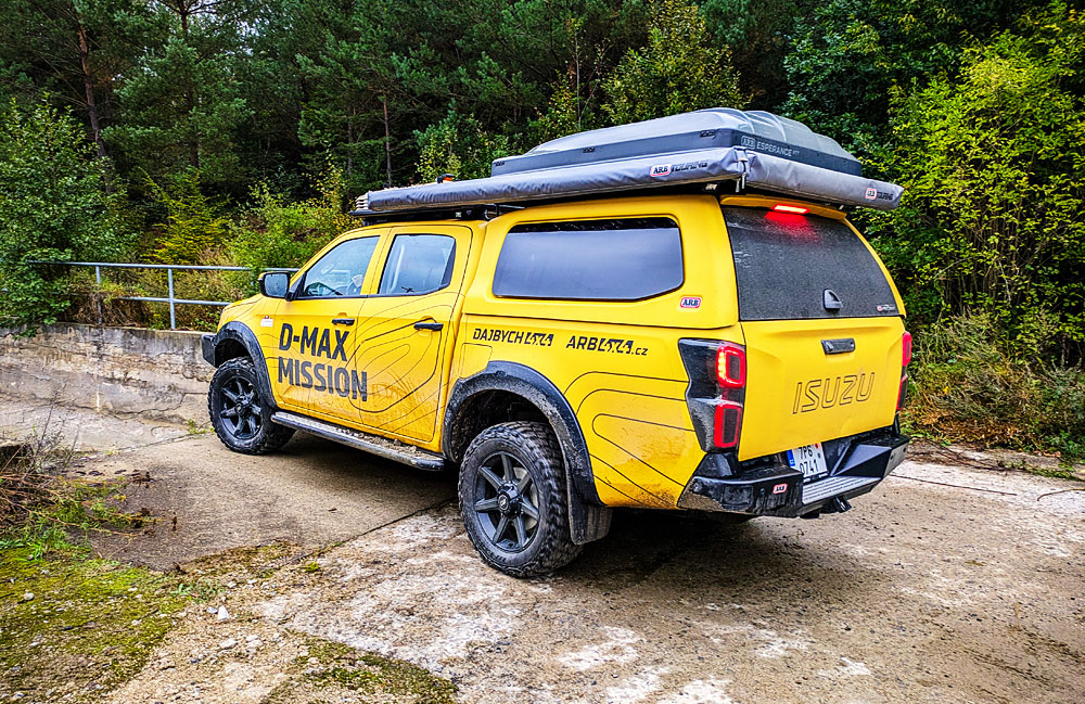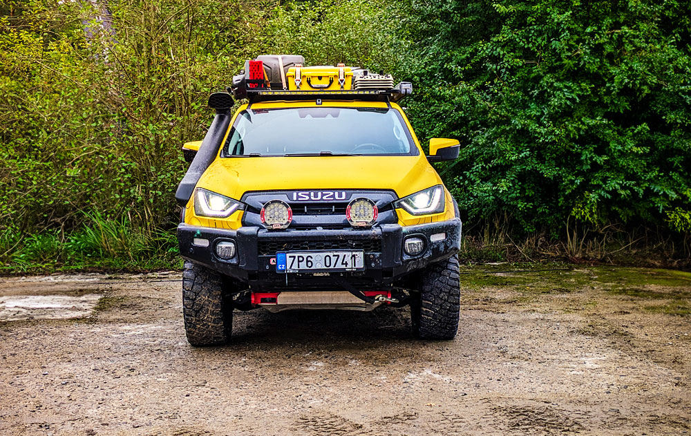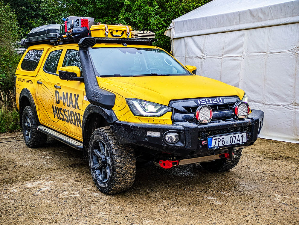 Já jsem se v Isuzu D-max mohl svézt pouze jako spolujezdec, ale zato mimo silnici v uzavřeném offroadovém areálu. Řídil ho zkušený instruktor, takže si s autem dovolil výrazně víc, než kdybych seděl za volantem jam Auto to nebylo jen tak ledajaké, ale jednalo se o speciálně upravený model určený na expedice. Nechyběl mu kompletně stavitelný podvozek, naviják, střešní nosič se stanem, několik reflektorů a kanystry. V základní výbavě má auto parkovací senzory, parkovací kameru, bezklíčový přístup, sledování mrtvých úhlů, automatické BI-LED světla, velký displej s Android Auto nebo Apple Car Play, kožený volat, … prostě má vše, co moderní auta.